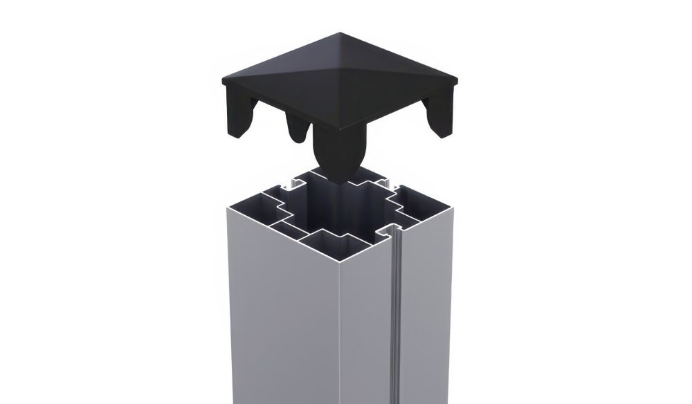 Der dreiseitig genutete Alupfosten wird mit Kappe und zwei Nutabdeckungen geliefert