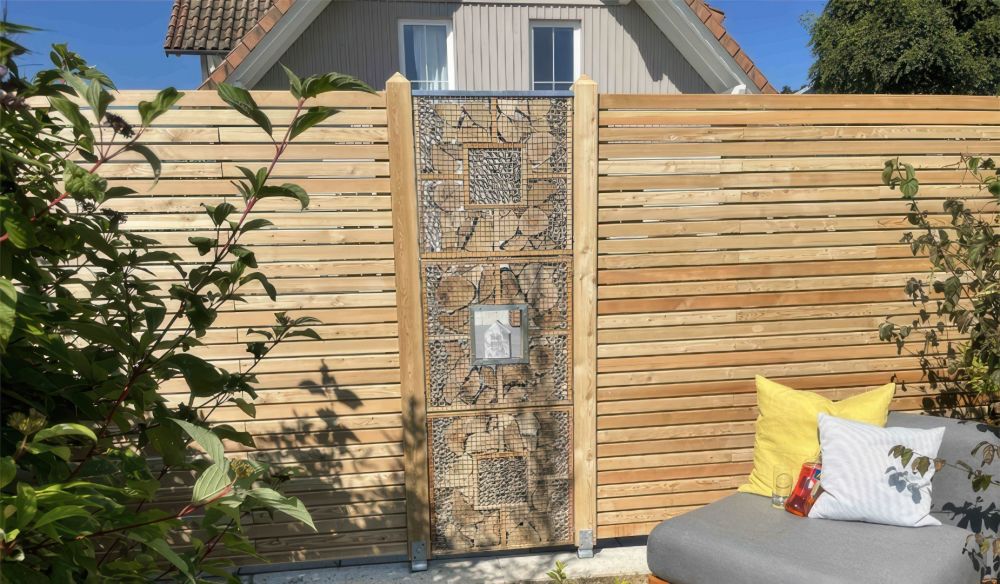 Der ansprechende Eyecatcher bietet den bedrohten Bestäubern einen Rückzugsort und verleiht Ihrer Sichtschutzwand eine exklusive Ausstrahlung. Von dem quadratischen Bienenhotel stehen zwei Ausführungen zur Wahl: mit Kreuz und mittigem Fenster. Bei der zweiten Variante lässt sich das Drahtgeflecht im Fenster bauseits herausschneiden und die Öffnung für individuelle Dekorationszwecke nutzen.