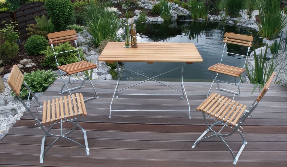 Im Sommer bietet der Garten eine schöne Gelegenheit, Freunde und die Familie einzuladen. Mit dem Bierzelt Möbelset Grenoble richten Sie eine gemütliche Sitzecke für solche Momente ein. Hier kommen alle zu fröhlichen Gesprächsrunden, einem gemütlichen Grillabend oder ausgedehnten Spieleabenden zusammen. Dank des Stahlgestells und der Robinienholz-Belattung sind der Tisch und die Stühle ausnehmend robust und pflegeleicht. Des Weiteren sind die Möbel aus dem Bierzelt Möbelset Grenoble klappbar.