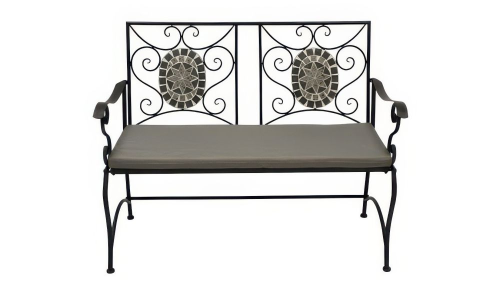 Dabei ist für eine hohe Stabilität und eine lange Lebensdauer gesorgt. Die kunstvoll gestaltete Rückenlehne mit Mosaiksteinplatten und die Sitzfläche mit Kreuzmuster setzen schöne Akzente. Rücken- und Armlehnen bestechen durch geschwungene Linien und verzierte Details. Sie machen den 2-Sitzer zu einem echten Blickfang, der sich perfekt in jede Umgebung einfügt.