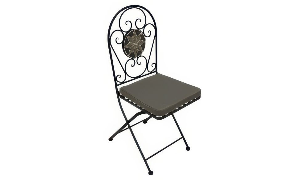 Der Bistrostuhl hat ein robustes Eisengestell, welches schwarz pulverbeschichtet und dadurch wetterfest und langlebig ist. Zudem sorgt es für große Standsicherheit. Die Rückenlehne ist kunstvoll gestaltet und mit einer Steinplatte in grau-weißem Mosaikmuster verziert. Ein attraktives Kreuzmuster verleiht der Sitzfläche einen besonderen Pfiff.