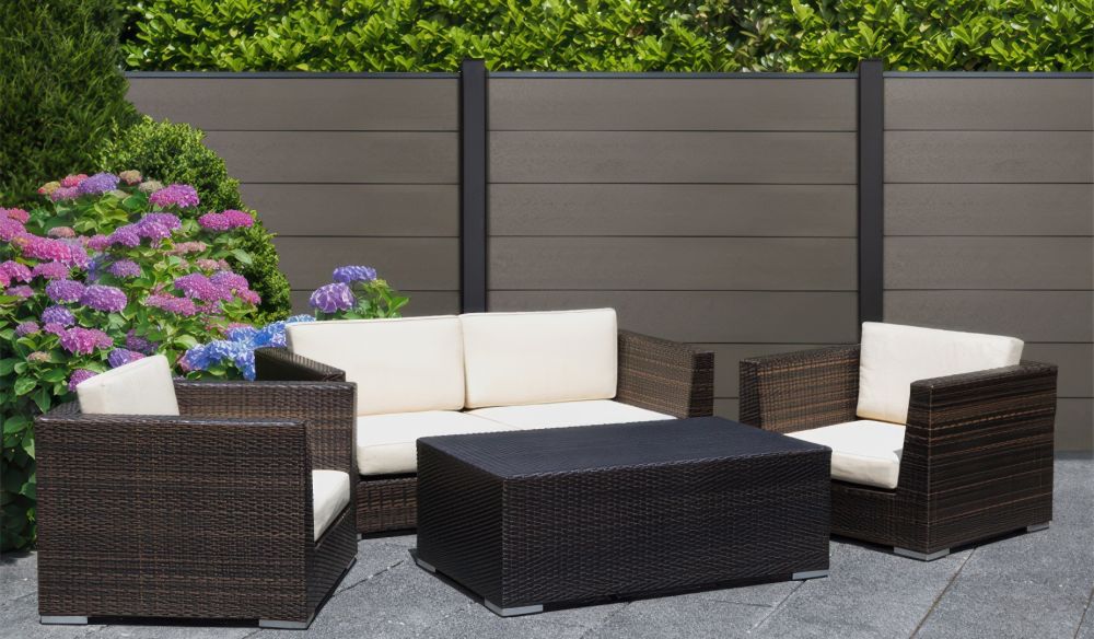 - 180 x 180 cm Zaunelement mit 7 extrabreiten BPC Lamellen für Sicht- und Windschutz auf der Terrasse.