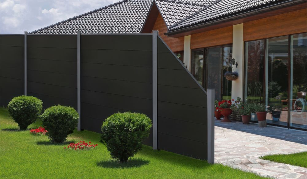 - Komplettset für ein 180 x 180 cm Sichtschutzelement mit sieben 180 x 24 x 1,9 cm BPC Lamellen Maxi in Schwarz.