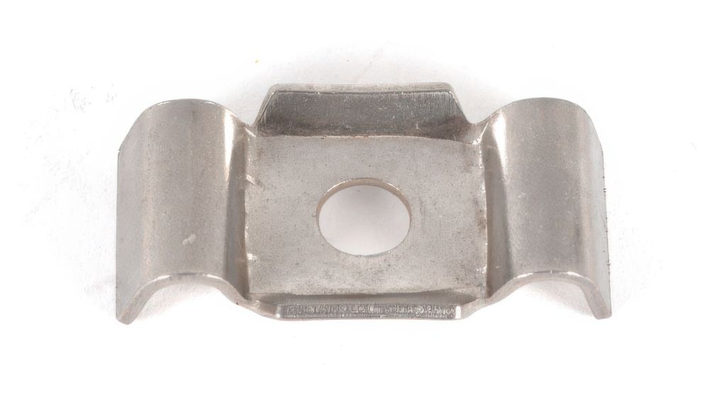 Die Doppelstabmatten Schmetterlingsklemme ist ein etwa 50 x 25 mm Wellenplättchen aus rostfreiem Edelstahl. Es erlaubt die Befestigung von zwei Gittermatten an Holzpfosten, Granitsäulen oder Fassaden. Dazu die äußeren Senkrechtstäbe der Gitter seitlich unter die beiden Flügel klemmen und den Haltebügel durch das mittige Loch auf dem gewünschten Träger verschrauben. Die Klemmlasche ist für leichte 6/5/6 mm und schwere 8/6/8 mm Ausführungen geeignet. Schrauben sind bauseitig zu stellen, der Lochdurchmesser beträgt 9 mm.
