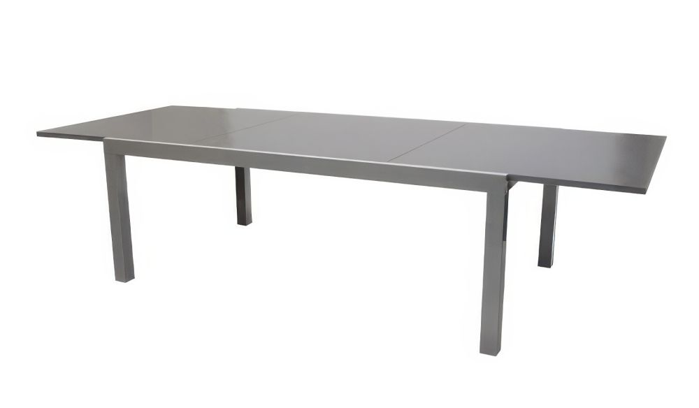 Das leichte Aluminiumgestell wurde pulverbeschichtet und kann bei jedem Wetter im Freien verweilen, ohne zu rosten. Die Tischplatte besteht aus grau bedrucktem Sicherheitsglas, das edel glänzt und unempfindlich gegen Kratzer ist. Das ist praktisch bei kleinen Kindern und erlaubt ein sorgenfreies Ein- und Ausfahren der Tischplatte. Darüber hinaus wirkt die Farbgebung überaus stilvoll, sodass Sie auf Tischwäsche verzichten können.