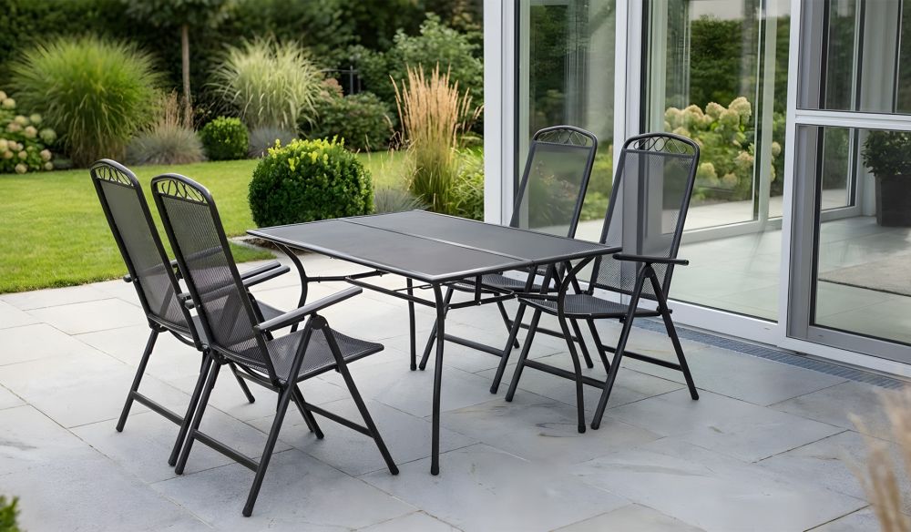 In der flachsten Stellung hat die Rückenlehne eine Tiefe von 106 cm, in der steilsten Stellung eine Höhe von 113 cm. Zusammengeklappt messen die Stühle 94 x 62 x 11 cm. Der großzügige Tisch bietet ohne Weiteres Platz für sechs Personen. Alle Teile sind im Spezialverfahren anthrazitfarben beschichtet.