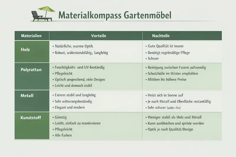 Wenn Sie Gartenmöbel kaufen, spielt das Material eine zentrale Rolle. Es entscheidet darüber, wie wetterfest Ihre Outdoor-Möbel sind, wie schwer sie sind, wie viel Pflege sie brauchen und wie sie sich anfühlen.