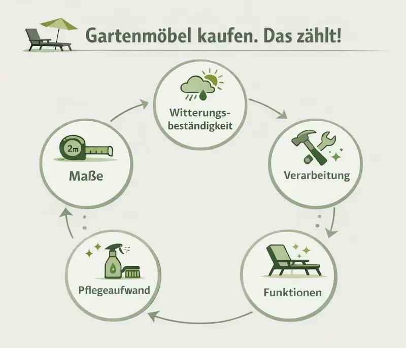 Wer Gartenmöbel kauft, sollte sich die Basics klarmachen: Wetterfestigkeit und Verarbeitung stehen an erster Stelle. Schließlich sind Outdoor-Möbel monatelang Sonne, Regen und Temperaturwechseln ausgesetzt. Ebenso wichtig ist der Pflegeaufwand. Manche Materialien sind nahezu wartungsfrei, andere brauchen regelmäßig eine Imprägnierung oder Reinigung.