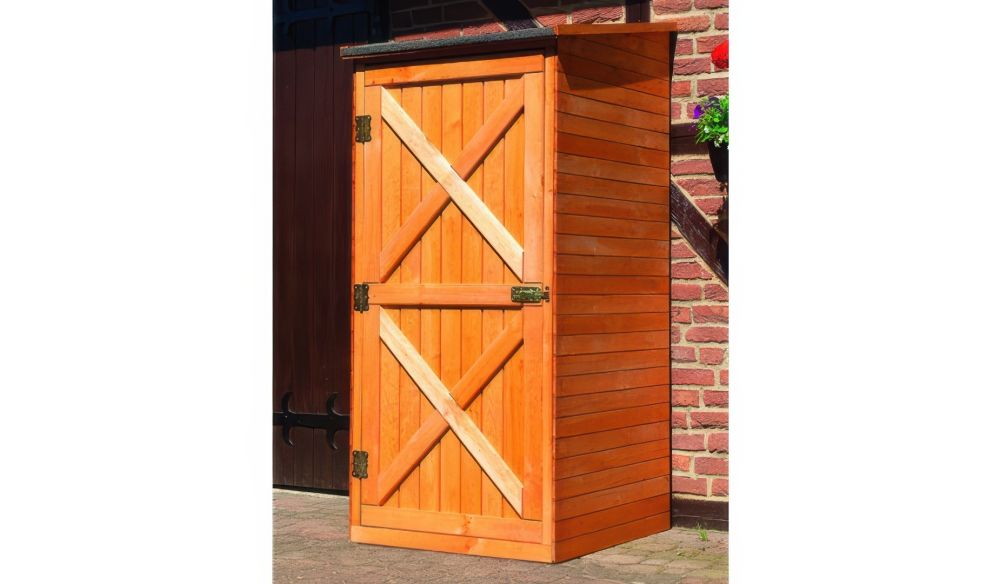 Der Geräteschrank aus Holz ist gegen Wind und Wetter gewappnet