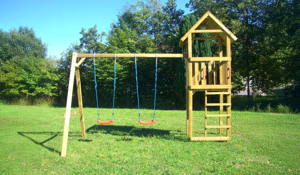 | Lieferumfang | kompletter Bausatz inkl. Turm und Doppelschaukel, ohne Wellenrutsche (optionales Zubehör); für mehr Standsicherheit gleich sechs Erdanker mitbestellen |
