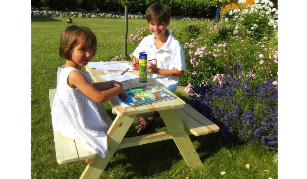 Als Materialien kommen bei der Kinder Gartenbank Donezk Fichte und Kiefer zum Einsatz. Diese Holzarten behaupten sich sehr gut gegen ganz verschiedene Witterungsbedingungen und besitzen eine entsprechend hohe Langlebigkeit. Zudem macht dieses Material optisch eine Menge her, weswegen die Kinder Gartenbank im Garten sehr gut aussieht und zum Sitzen einlädt. Eine besondere Stärke dieses Produkts zeigt sich daran, dass es unbehandelt ist. Die Bank ist somit kindgerecht und erfüllt hohe Ansprüche an Sicherheit. Diese Qualität wird auch von unabhängigen Testern bestätigt, denn die Kinder Gartenbank ist aus naturbelassenem FSC zertifiziertem Holz und ist daher ideal für eine farbliche Nachbehandlung geeignet. Die Verarbeitung ist sehr gut, was sich an der hohen Standfestigkeit und den glatten Oberflächen am Tisch und der Sitzfläche zeigt. Die Bank lässt sich ohne Schwierigkeiten aufbauen und im Garten transportieren, sodass Sie diese leicht an der idealen Position aufstellen. Bieten Sie Ihren Kindern eine komfortable, ansprechende und hochwertige Sitzgelegenheit. Und falls dieses Produkt nicht Ihren Bedürfnissen entspriche, laden wir Sie gerne ein unsere Spielgeräte für Kinder zu durchstöbern.