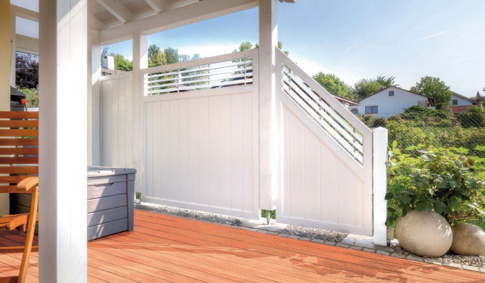 Den Kunststoff Sichtschutzzaun prägen geschlossene Elemente mit senkrechten Paneelen und schräg gestellten Lamellen im Kopfbereich. Sie glänzen mit einer besonders stabilen und durchdachten Konstruktion. Zum Einsatz kommen solide Füllungspaneele mit zuverlässiger Nut-Feder-Verbindung. Sie werden von geschweißten Rahmenprofilen eingefasst. Die Profile sind innen mit Füllungsleisten und außen mit Verlängerungen ausgestattet. Das schenkt den Paneelen rundum einen sicheren Halt. Für Dauerhaftigkeit sorgen weiter Holz-Inlays in den seitlichen Rahmen und ein Alu-Profil im unteren Rahmen. Die Verstärkungen gewähren ein Höchstmaß an Stabilität.