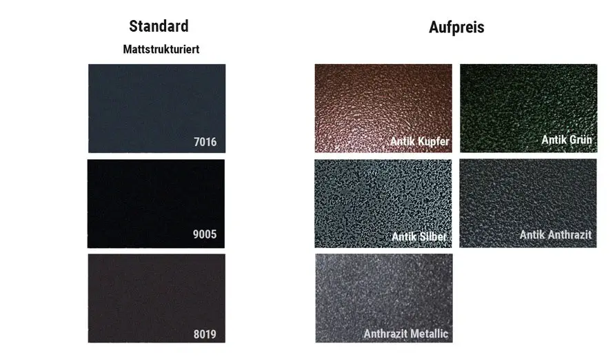 - Auf Anfrage auch in Schwarz, Graubraun, Antik Silber, Anthrazit Metallic und weiteren Farben erhältlich.