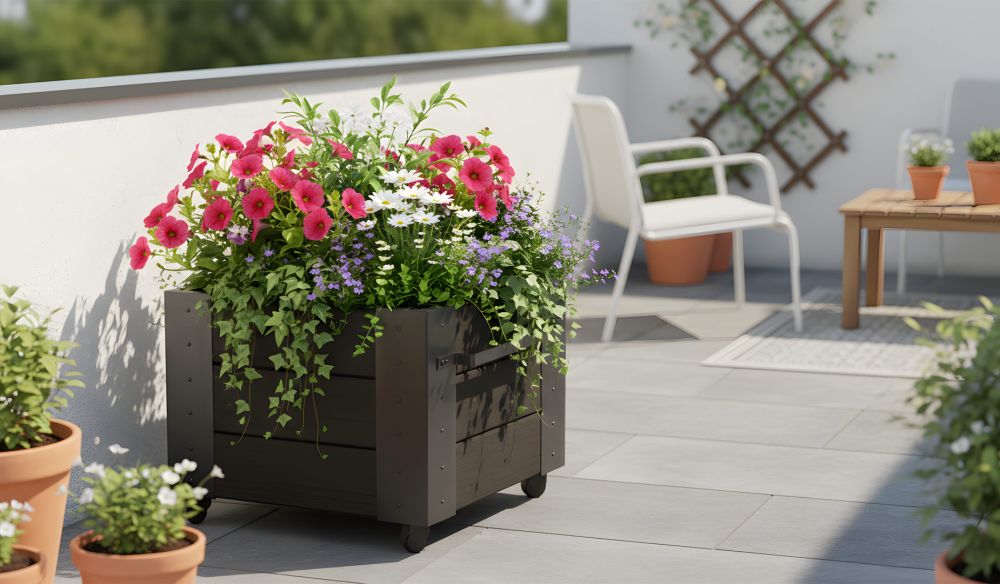 Rollbare Pflanzkästen liegen im Trend. Immer mehr Gartenfreunde setzen auf die flexibel einsetzbaren Pflanzgefäße. Kein Wunder, diese lassen sich auf der Terrasse je nach Witterung und Jahreszeit beliebig positionieren. Wenn auch Sie sich von diesem Gartentrend angesprochen fühlen, stellt der Cubic Pflanzkübel Klein mit Sicherheit eine exzellente Wahl dar. Denn bei diesem kleinen Pflanzkübel wird Qualität großgeschrieben. Aufgrund seiner hochwertigen Ausstattungsmerkmale ist er genau das richtige Accessoire für durchgestylte Außenanlagen. Das Beste dabei: Optisch wird Cubic immer ihren Geschmack treffen, denn bei dieser wunderschönen Konstruktion wählen Sie aus drei Ausführungen Ihren Favoriten. Sie haben die Auswahl zwischen zwei Farben (Schwarz und Graubraun) sowie zwei Beschlagsarten: Feuerverzinkt oder feuerverzinkt und pulverbeschichtet.