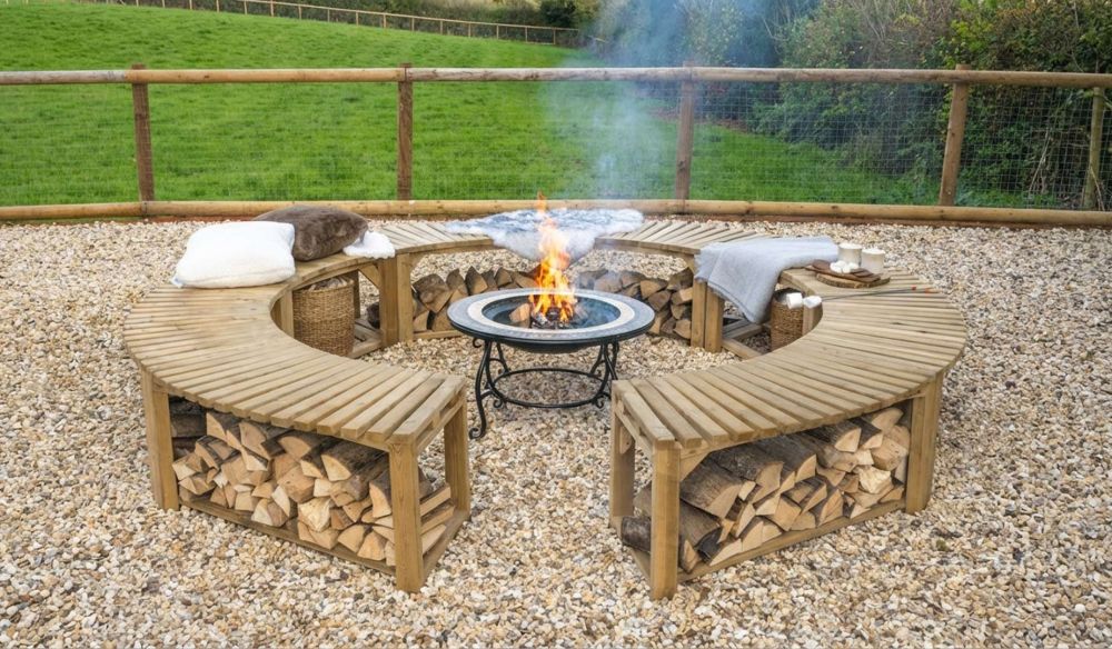 - Stauraum inklusive: Unter der Sitzfläche lassen sich Holzscheite griffbereit stapeln. Das hält den Bereich aufgeräumt und das Brennholz nah am Feuer.