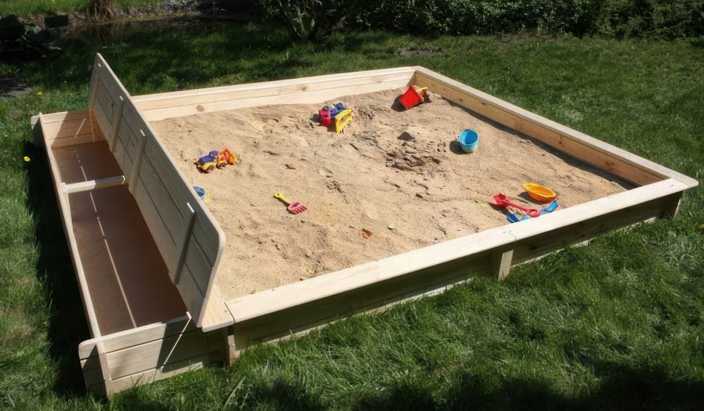 Robuster 225 x 225 cm Sandkasten aus Lärche mit praktischer Seitenbox