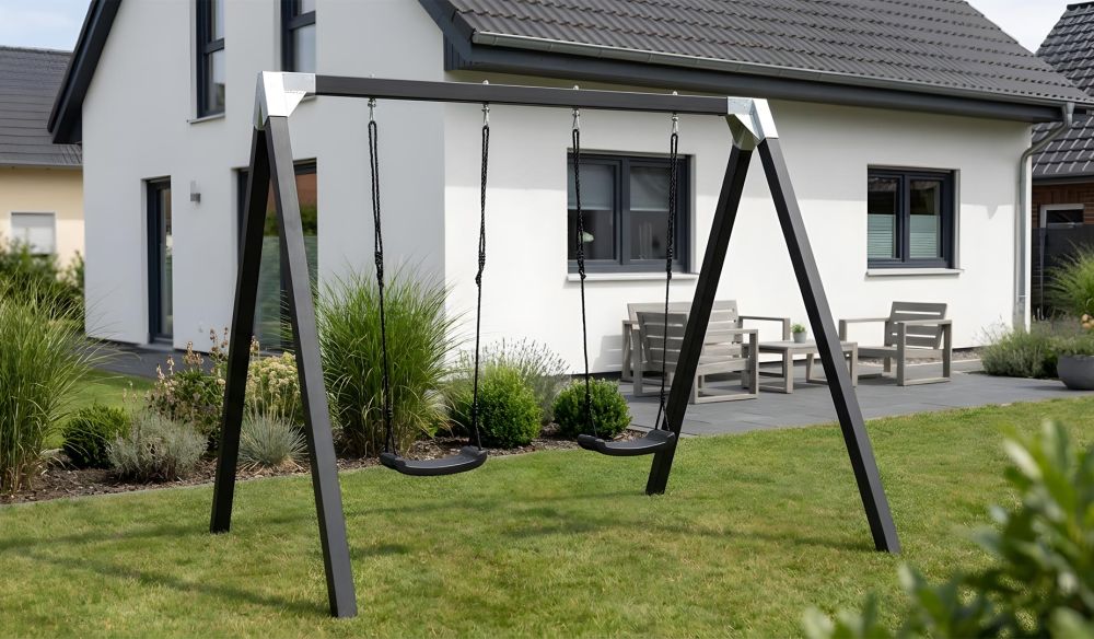 Eine typische Situation auf dem Spielplatz: Während die Sprösslinge gar nicht genug vom Schaukeln bekommen können („Höher! Noch höher!“), und vielleicht sogar den Kopf in den Nacken werfen, wird den Eltern schon allein vom Zuschauen schwindelig. Doch Kinder sind auf solche Stimulationen angewiesen, um den Gleichgewichtssinn auszubilden. Es ist erwiesen, dass Kleinkinder früher stehen und sitzen können als Gleichaltrige, wenn sie beizeiten durch Schaukel- und Drehbewegungen stimuliert werden. Wenn Sie die Entwicklung Ihrer Kinder zielgerichtet fördern möchten, dann ist das Schaukelgestell Luxus genau die richtige Anschaffung für Ihre Familie. Sie können das Gestell als Einzelschaukel oder Doppelschaukel für zwei Personen nutzen. Ob mit dem Geschwister, Mama oder Papa, das robuste sorgt für großen Spaß im Garten.