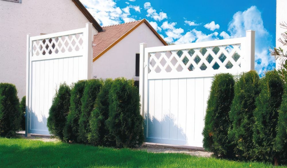 - Für den Kunststoff Sichtschutz sind geschlossene Zaunelemente mit senkrechten Paneelen und diagonalen Rankgittern im Kopfbereich kennzeichnend.