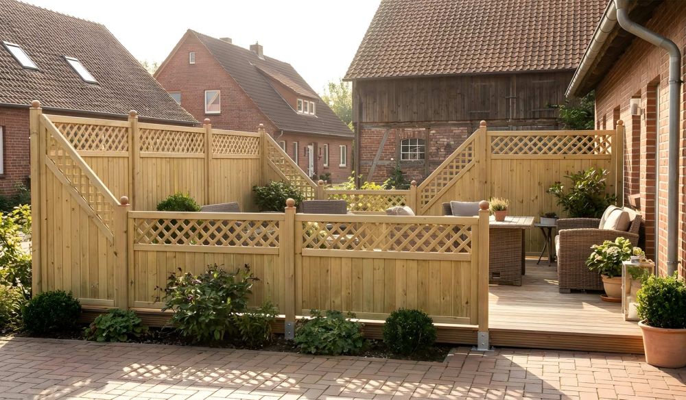 Durch die Kombination aus massiven Profilbrettern und Rankgittern wirken die Sichtschutzwände gleichzeitig schutzgebend und dekorativ – ein echtes Multitalent für moderne und klassische Gärten.