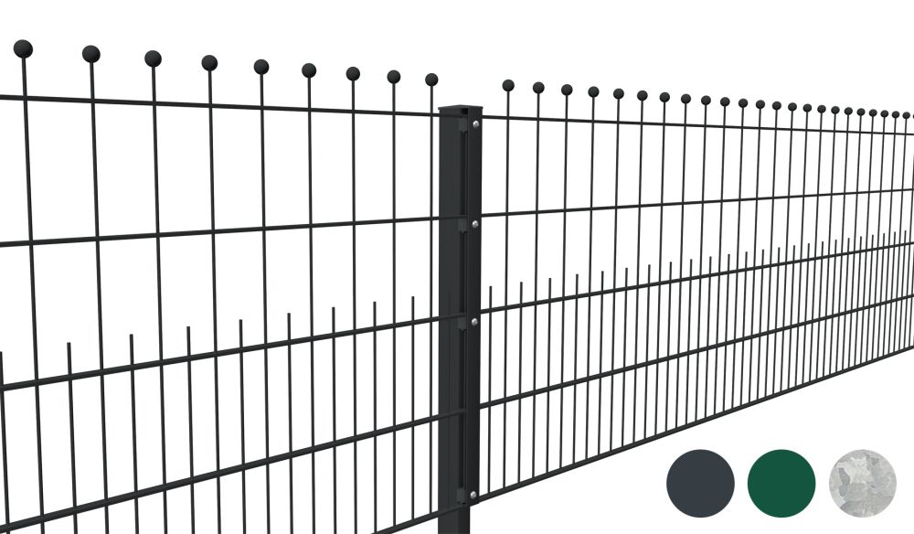 2. Höhe: Ihre Stahlmatten sind in vier Größen bestellbar: 700, 900, 1100 und 1300 mm. Die Höhe bezieht sich auf die Kugelreihe, der Abstand zwischen den Zierkugeln und dem oberen U-Profil beträgt 100 mm. Entsprechend ragen die Kugeln bei der fertig montierten Zaunanlage über den Pfosten hinaus, das U-Profil und der Pfostenkopf liegen etwa auf einer Linie.