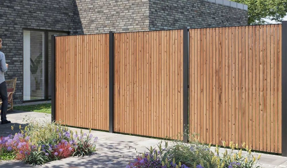 Die Kombination aus dauerhaften Thermo-Kiefer-Lamellen und witterungsbeständigen Stahlpfosten sorgt für ein zeitlos modernes Erscheinungsbild und minimiert den Pflegeaufwand. Gleichzeitig lässt sich der Zaun dank Stecksystem gut an die Vor-Ort-Situation anpassen.