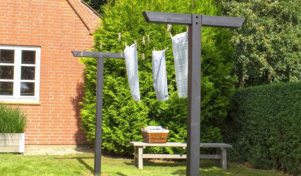 Häufig leiden Familien unter dem Problem, dass zu viel Wäsche anfällt. Oder anders ausgedrückt: Es zu wenig Möglichkeiten zum Trocknen gibt. Gartenbesitzer sind hier eindeutig im Vorteil, sie können die Wäsche draußen trocknen lassen, auf der Terrasse oder dem Rasen. Das spart Platz. Und ist gut für die Wäsche – die Trocknung durch Sonne und Wind ist textilschonend und sorgt für einen angenehmen Duft. Eine besonders ansprechende Lösung ist unsere robuste 400 x 90 x 185 cm Wäscheleine Garten aus druckimprägnierter und schwarz farbgrundierter Kiefer/Fichte (RAL 9005). Die wird fest im Boden installiert