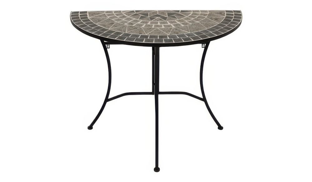 Der halbrunde Wandtisch besteht aus einem robusten, pulverbeschichteten Eisengestell in Schwarz, das hohe Standsicherheit garantiert. Die hochwertige, halbrunde Tischplatte setzt sich aus Mosaiksteinen zusammen. Bei der Farbgebung haben Sie die Wahl zwischen Grau-Weiß und Terracotta. Das einzigartige Design verleiht Ihrem Freiluft-Wohnzimmer eine gemütliche Atmosphäre. Top: Durch seine langlebigen Materialien ist der 90 x 45 x 75 cm Halbrundtisch absolut pflegeleicht; er kann bei Bedarf einfach mit einem feuchten Tuch gereinigt werden.